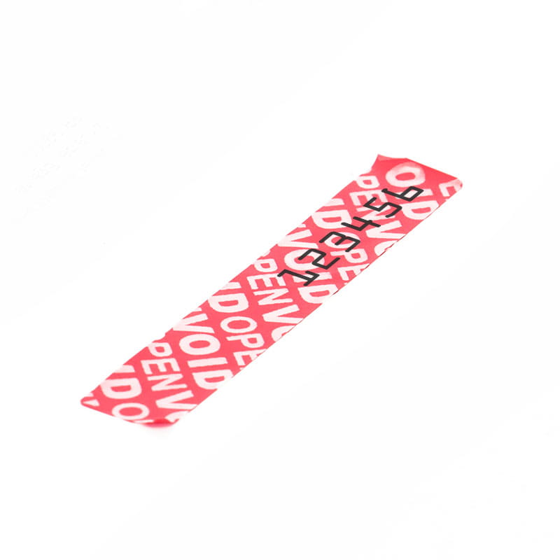 Efter avlägsnande syns text VOID/OPENED men endast på etiketten. Underlaget är rent: utan spår av lim eller färg. Tryck av sekventiell numrering, personalisering: logotyp, namn, streckkod.