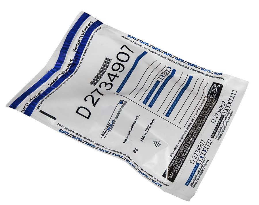 Tillverkad av coextruderad folie beständig mot sprickning, dubbla svetsfogar på sidokanter, 2 kvitteringsdelar på toppen av kuvertet. Unik numrering av kuvert.